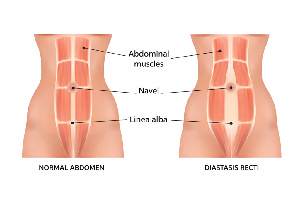 Diastasis recti occurs when the rectus abdominis muscles, commonly known as the “six-pack” muscles, separate along the midline of the abdomen.