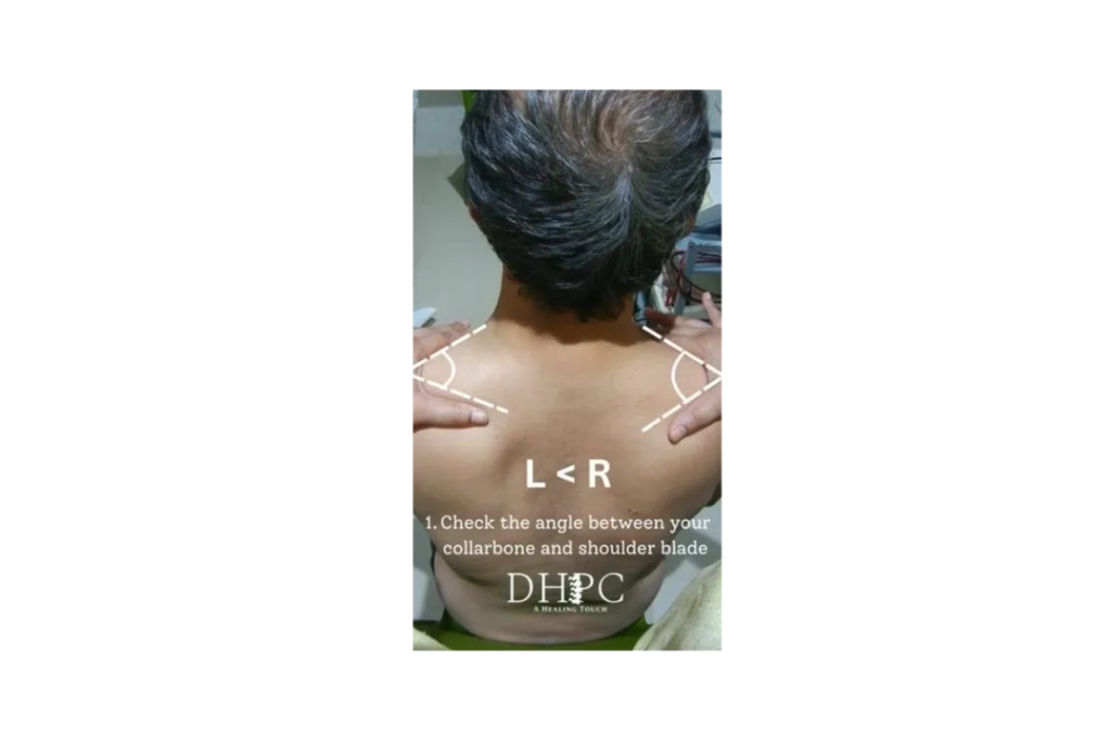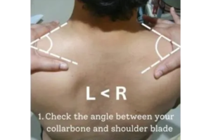 Place your index finger along your collarbone and your thumb along your shoulder blade. Compare the angle between your thumb and index finger on both sides. If the angles are different, one of your shoulders might be at risk.