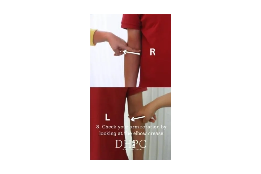 “Finally, check your arm rotation by looking at your elbow crease. If one side shows the full elbow crease but the other does not, your shoulder or elbow on that side might be at risk.