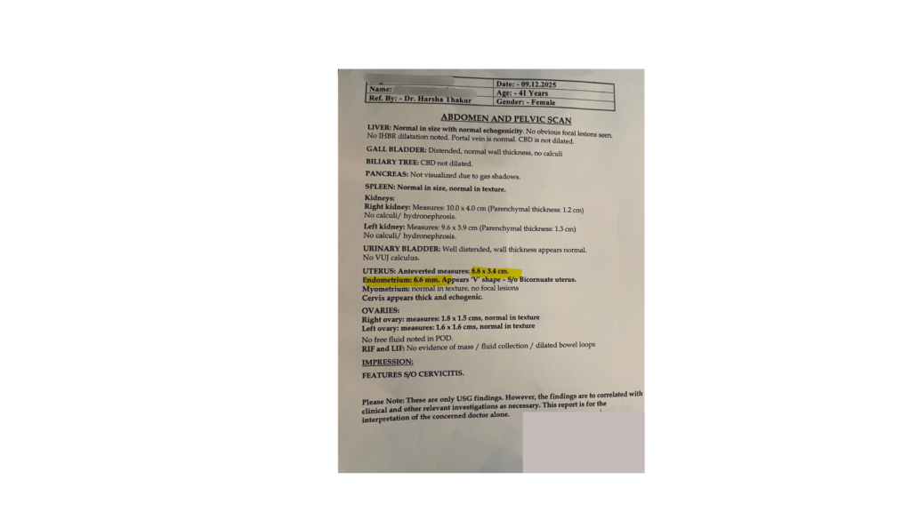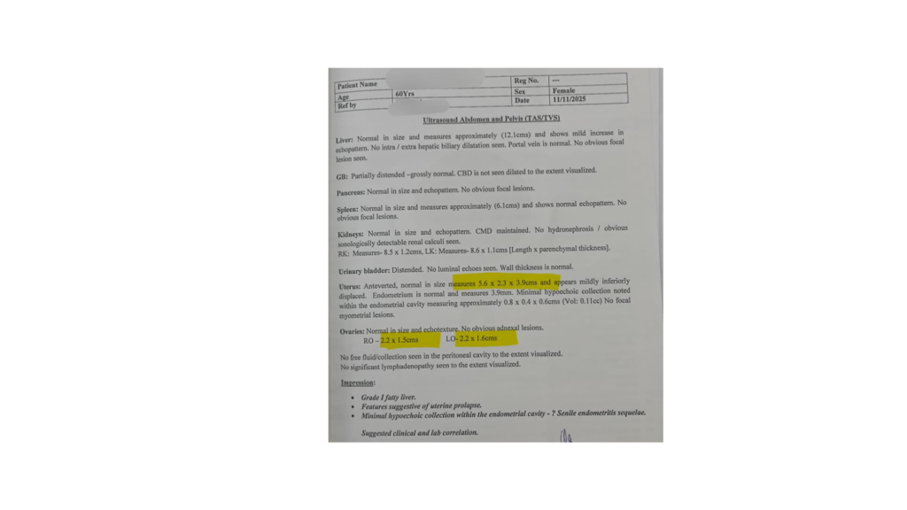 • Right ovary: 3.4 × 2.2 × 1.8 cm (Vol: 6.8 cc)