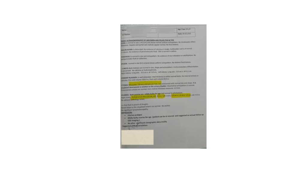 A 59-year-old female presented with general abdominal discomfort and internal health concerns. Her ultrasound findings showed mild uterine displacement, fatty liver (Grade 1), and ovarian measurements within normal but monitored range. She was looking for a supportive, non-invasive approach to improve internal function and overall well-being.